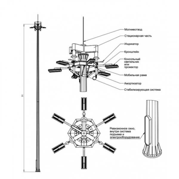 Высота высокомачтовых опор МГФ 30 метров. Их грузоподъёмность составляет до 500 кг. Количество прожекторов в каждой опоре — до 6 штук.